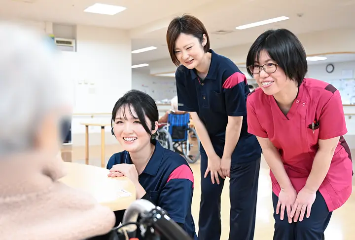 介護職は、無資格・未経験の方も歓迎! そして、働きながら資格取得が 目指しやすいように、実務者研修費用を援助。介護福祉士資格の受験費用も全額負担しています。そのため介護福祉士率は約75%と高いです。